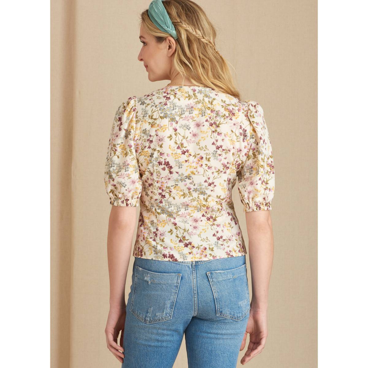 Die halb taillierte Bluse mit tiefem V-Ausschnitt oder Rundhalsausschnitt hat Knöpfe in der Mitte vorne und einen Schlaufenverschluss mit Untertritt- und Spitzenbesatzoptionen. Bluse hat Variationen für geraffte oder ausgestellte Ärmel oder ärmellos. Alle Ansichten haben hintere Taillenabnäher.