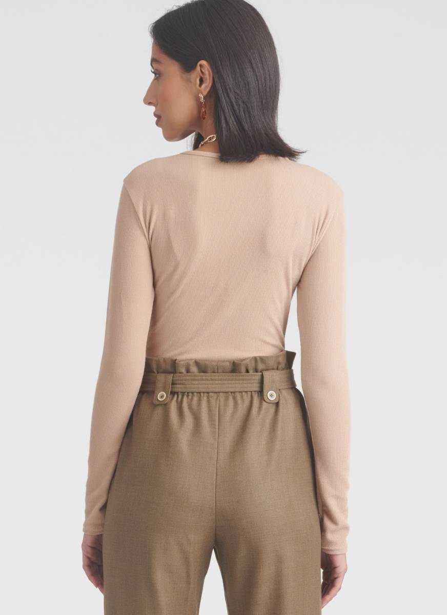 Das Cargohosen-Nähmuster für Damen verfügt über eine hohe Taille, Cargotaschen und einen Kordelzug am Saum. Geeignet für Chino, Denim und Leinenmischungen.