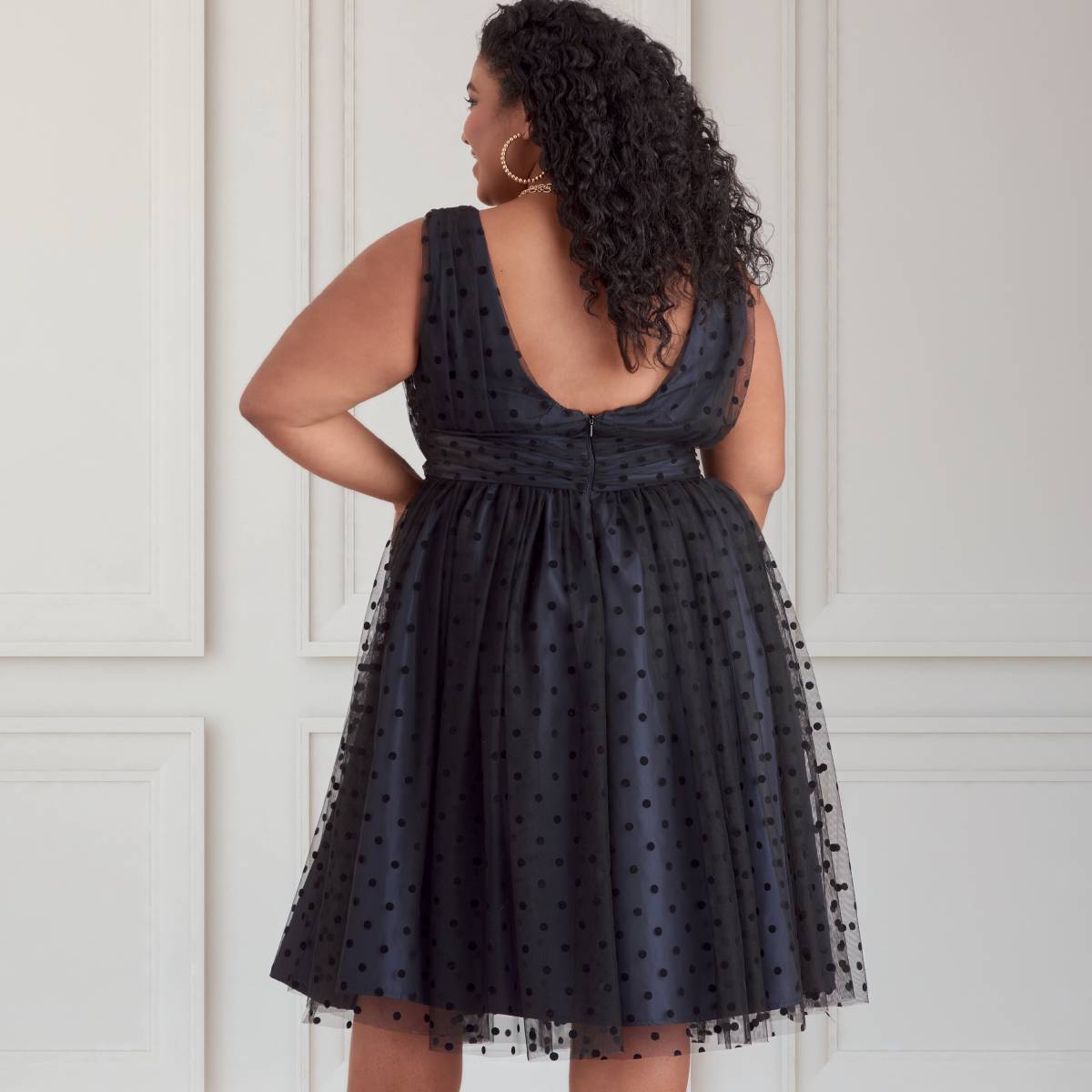 Die Kleider mit herzförmigem Ausschnitt in zwei Längen haben die Option für kontrastierende Überzüge. Alle Kleider haben einen gerafften Bund und einen gerafften Rock und bieten Rückenvarianten für einen tiefen V-Ausschnitt oder einen geschlossenen Rücken mit Taillenabnähern.
