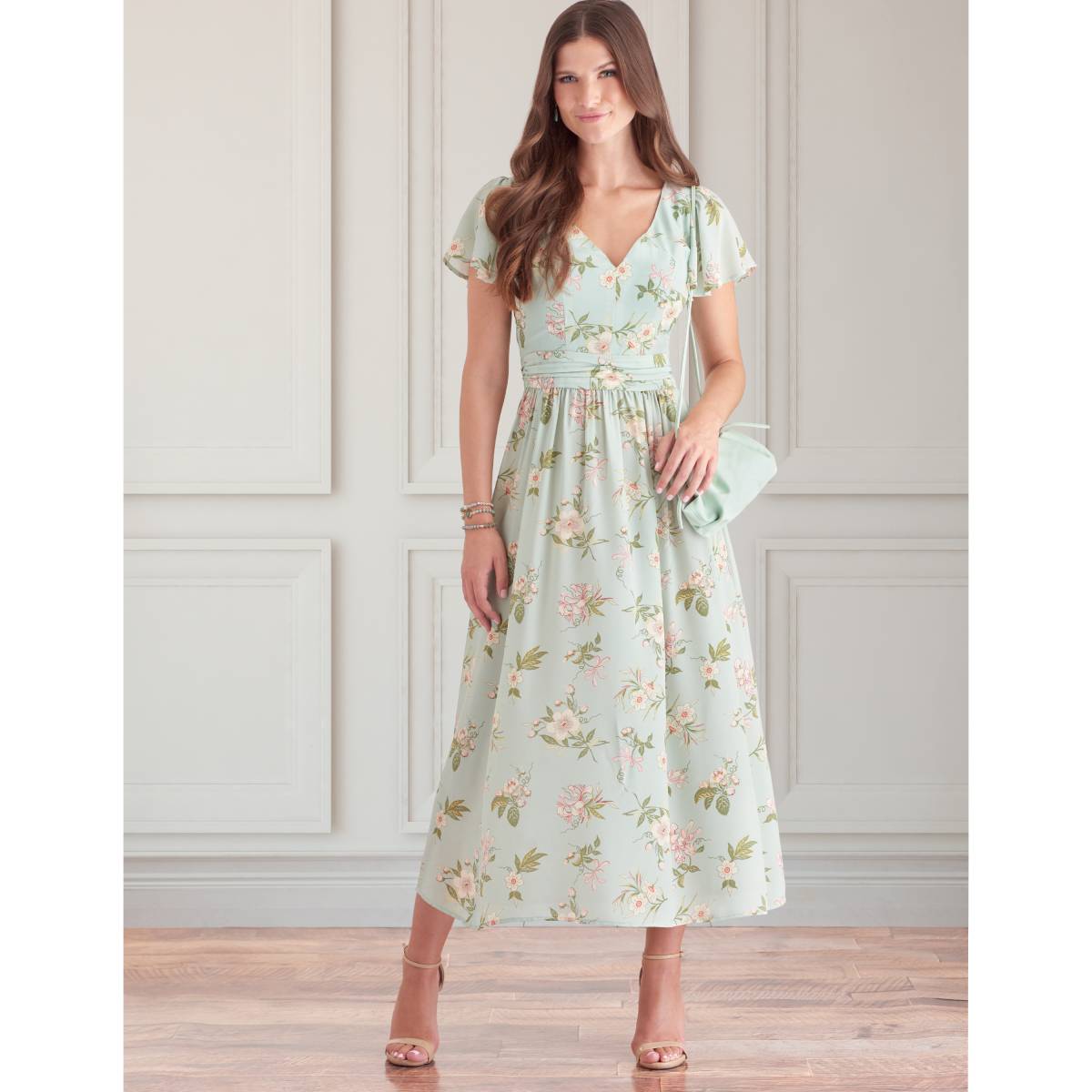 Kleider mit tiefem herzförmigem Ausschnitt haben Brustkörbchenverstellung in zwei Längen mit Option für kontrastierende Überzüge. Dieses Muster hat einen gerafften Bund und einen gerafften Rock, Rückenvarianten für eine tiefe V-Öffnung oder einen geschlossenen Rücken mit Taillenabnähern.