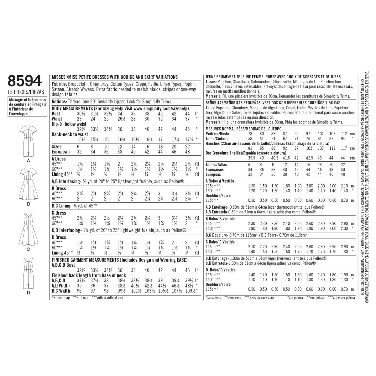 Simplicity Schnittmuster Damen Kleider ärmellos/Kurzarm #8594.H5 Gr. 16-20