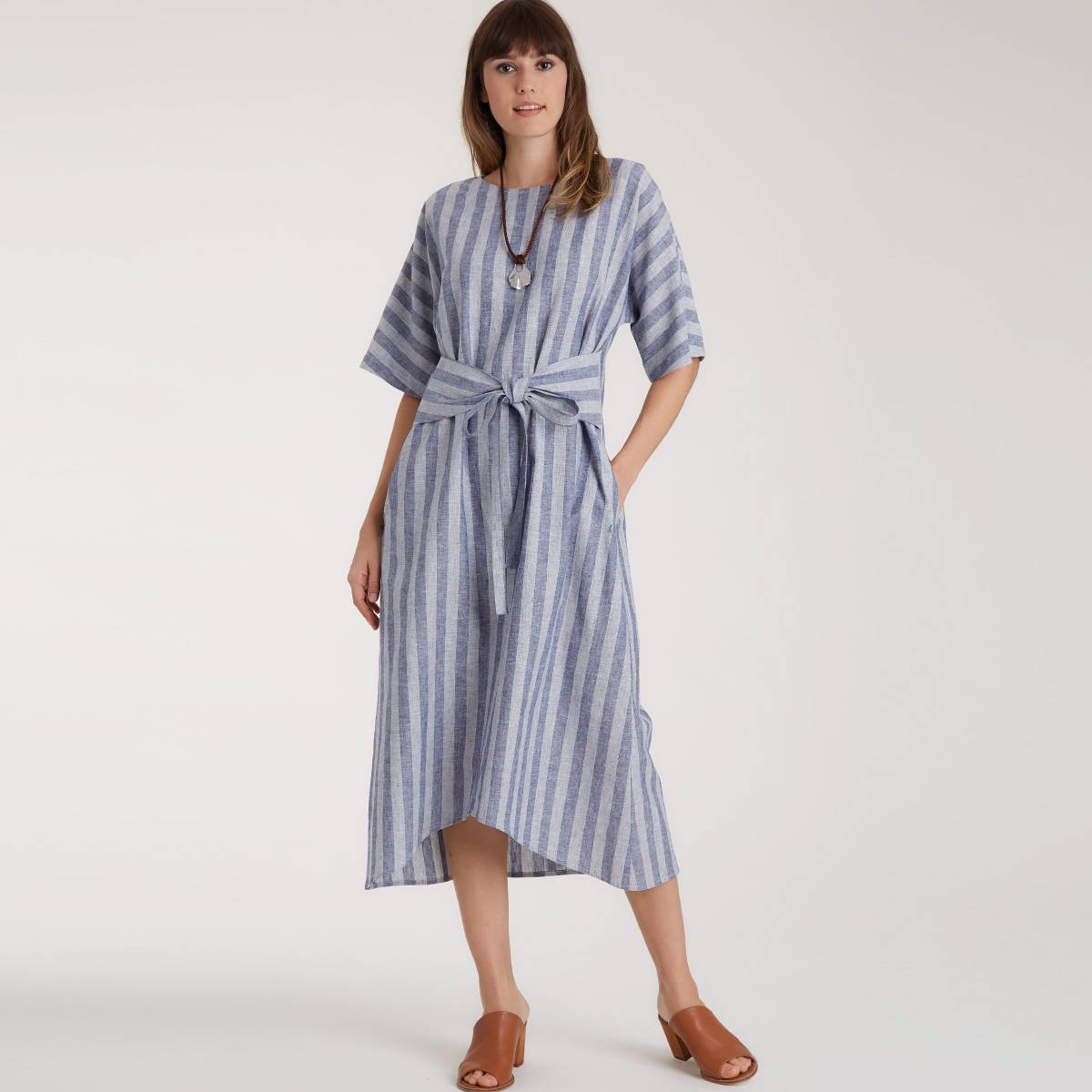 Das Midi-Kleid mit überschnittenem 3/4 Arm gibt es in zwei verschiedenen Längen und in je drei Variationen. Variation A verfügt über einen Kordelzug, der die Taille in Szene setzt. Für Variation B und C hingegen umschmeichelt ein Wickelgürtel die Taille, der vorne zur Schleife gebunden wird.