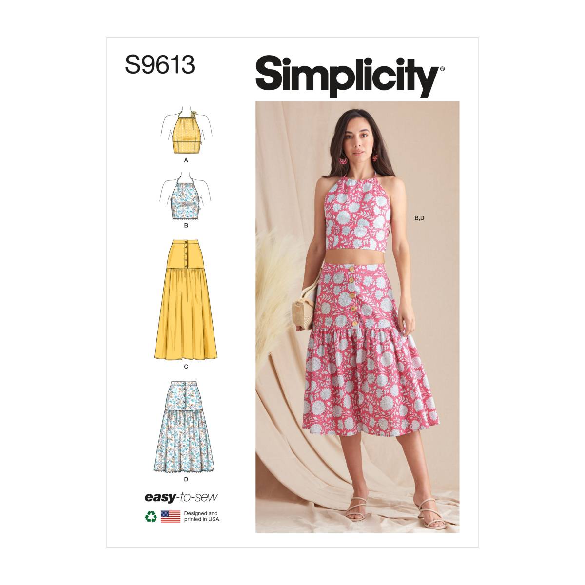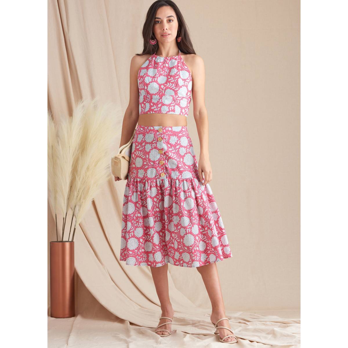 Kurz geschnittenes Neckholder-Top mit Brust- und Taillenabnähern und Seitennaht-Reißverschluss mit Variation für niedrigen oder hohen Rücken. Gestufter, taillierter Rock in zwei Längen mit funktionierenden Knöpfen vorne, weichen Raffungen und Besatzoptionen.