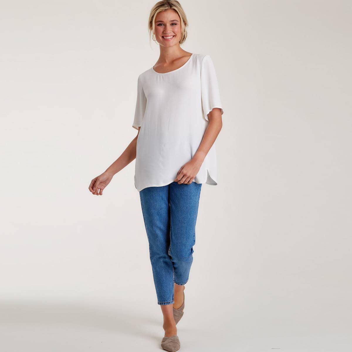 Die leichte Bluse gibt es in verschiedenen Ärmel- und Saumvariationen. Die Rückenpasse mit Rückenfalte setzt optisch Akzente und die aufgesetzte Tasche, bei Variante A und C, ist praktisch und verspielt zugleich.