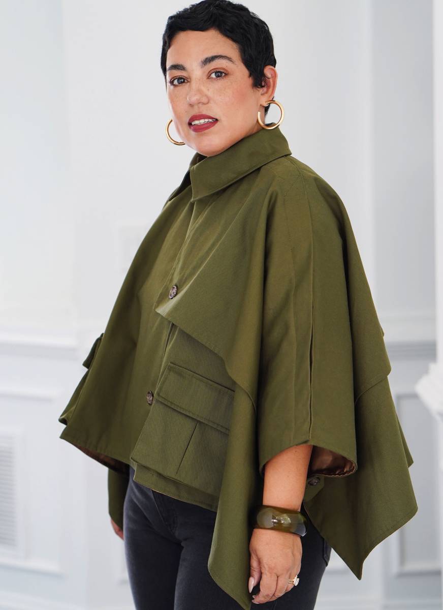 Entdecke das vielseitige Cape von Mimi G Style! Diese cropped Trench-Cape mit spitzem Kragen und praktischen Cargotaschen mit Falten und Klappen ist ein echtes Highlight. Mit Knöpfen und verstellbaren Ärmeln bietet es Funktion und Stil. Empfohlene Stoffe: Broadcloth, Denim, Tweed, Twill und mehr. Perfekt für jede Gelegenheit und jeden Look!