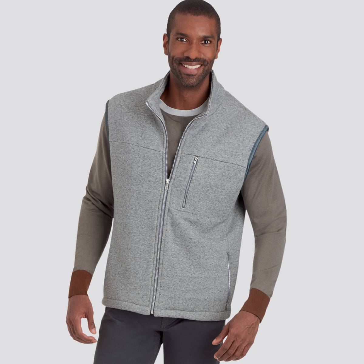 Herrenweste und /-jacke mit Stehkragen, Trennreißverschluss und Taschendetails.