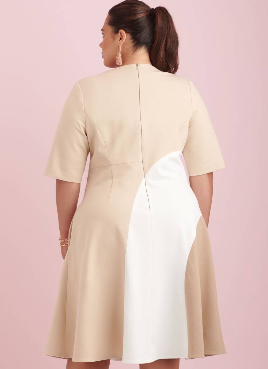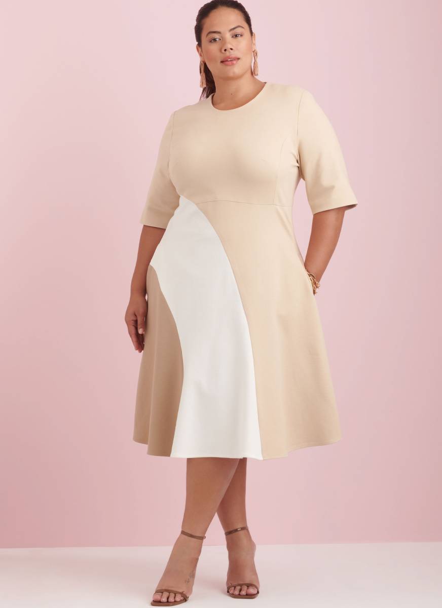 Das Schnittmuster für ein figurbetontem Kleid mit farblich abgesetzten Stoffen verleiht dir einen eleganten Look. Mit Prinzessnähten und Abnähern im Oberteil passt es perfekt. Wähle aus drei Längen und entscheide dich für Ärmel oder nicht. Modell A hat einen Halsabschluss und alle Varianten haben seitliche Taschen. Ideal für Challis, Charmeuse, Crepe und mehr.