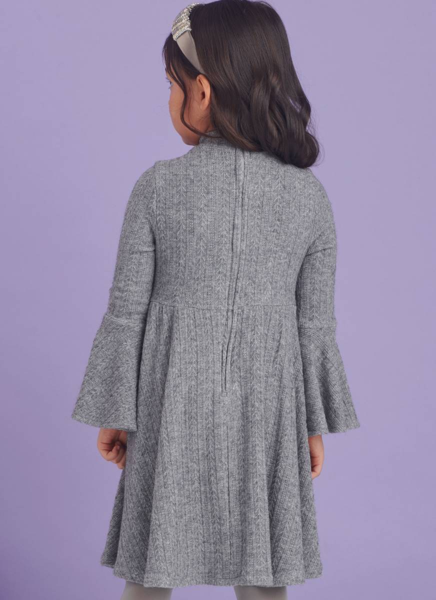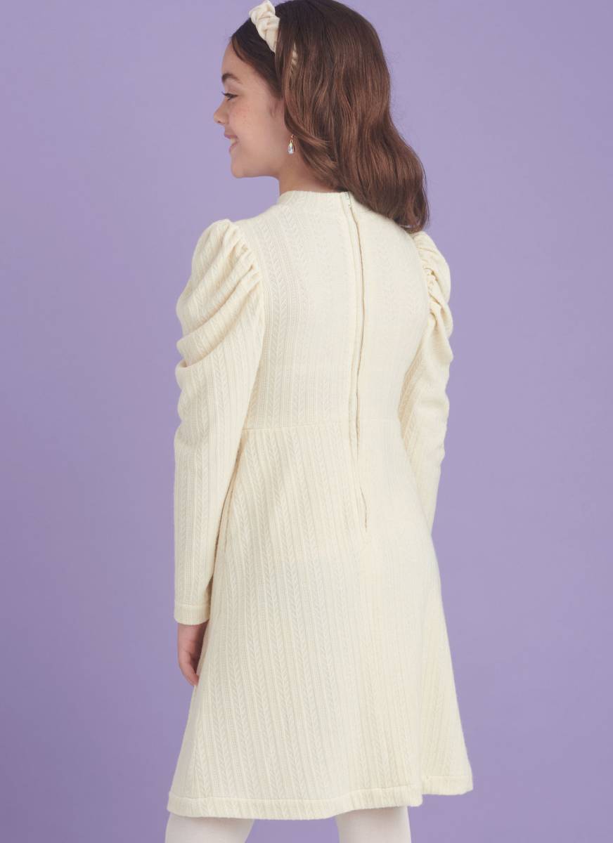 Bezauberndes Strickkleid-Schnittmuster für Mädchen mit wahrweise Volantsärmeln und Raffungen. Hohes Nackenband und Reißverschluss hinten. Empfohlene Stoffe sind Bamboo und Ponte.