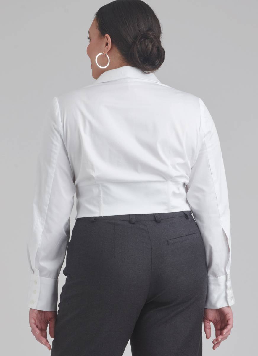 Die zeitlose Hemdbluse präsentiert eine moderne Korsett-Silhouette mit Raffungen im Brustbereich und einem Reißverschluss vorne. Nähe passend dazu eine klassische Slim Fit Hose. Empfohlene Stoffe sind Baumwollmischungen, Leichte Leinenmischungen und Popeline.