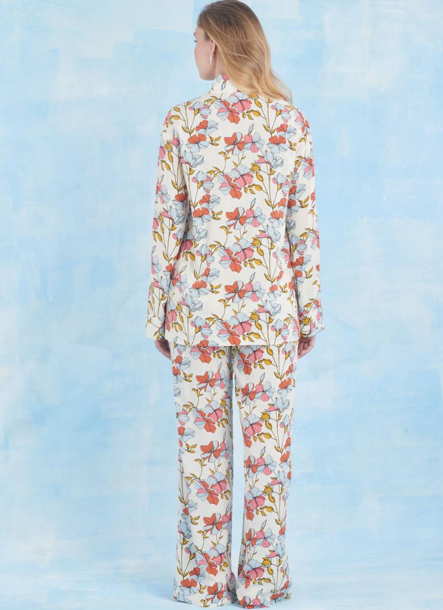 Dieses Schlafanzug-Schnittmuster umfasst eine Bluse mit Kragen, lange Hose und Shorts mit elastischem Bund. Ideal unter anderem für Kreppstoffe.