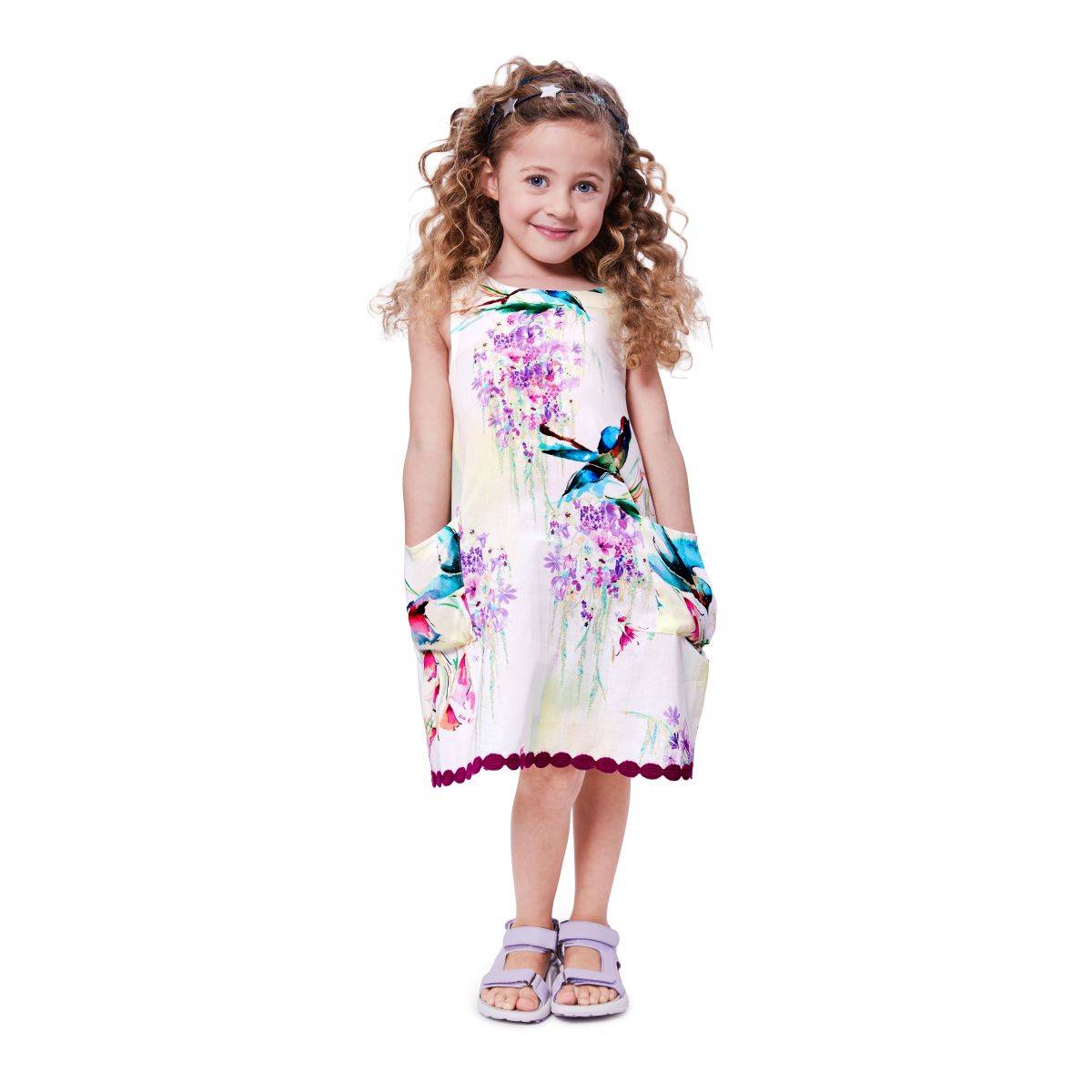 Three enchanting dresses for special occasions: The first dress impresses with a waterfall look created by three ruffle lines – light, loose and perfectly festive for summer. The second style stands out with sewn-on pockets, trim at the hem and a cheeky A-line silhouette – ideal for birthday girls who want to look chic without being too fancy. The third dress combines floating feathers and flutter sleeves for a mix of romance and playful spirit. All three versions feature a button placket at the back – a lovely detail that completes each dress.
