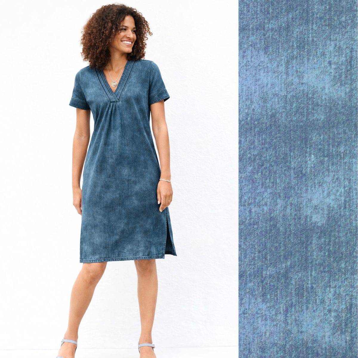The jersey in a denim look impresses with its high-quality finish and pleasantly soft, elastic feel. Thanks to the high cotton content combined with Lycra, the fabric offers excellent wearing comfort, shape retention and reliable stretch recovery. With a weight of 210 g/m², it has a stable yet supple structure, making it ideal for close-fitting as well as comfortable designs. The rotary print gives the fabric its authentic denim appearance with an even and long-lasting colour effect. A versatile jersey, perfect for modern garments such as shirts, dresses, skirts or comfortable casual wear.