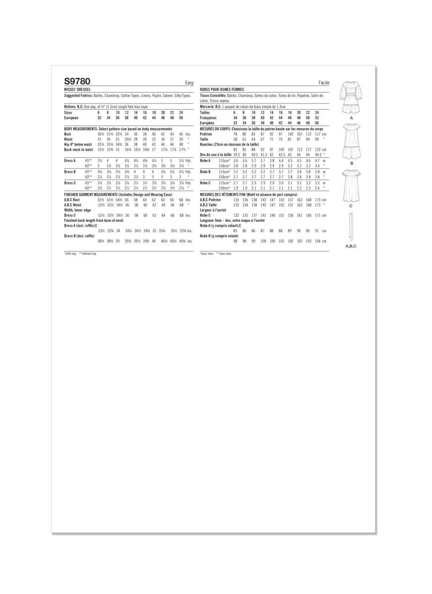 Misses' easy-to-sew dresses has sleeve, length and ruffle flounce variations. Dress includes ties and bias binding at neckline and separate tie sash.