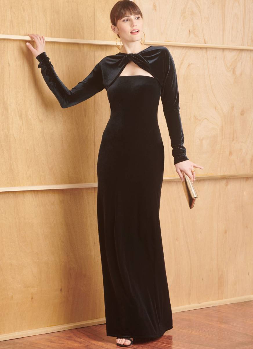 Semi-fitted dress in two lengths is slightly flared at hem and has back invisible zipper closure. View A dress is midi length with draped off-the-shoulder neckline. View B is a strapless long length dress. The shrug has center front knot with a pull through tie.