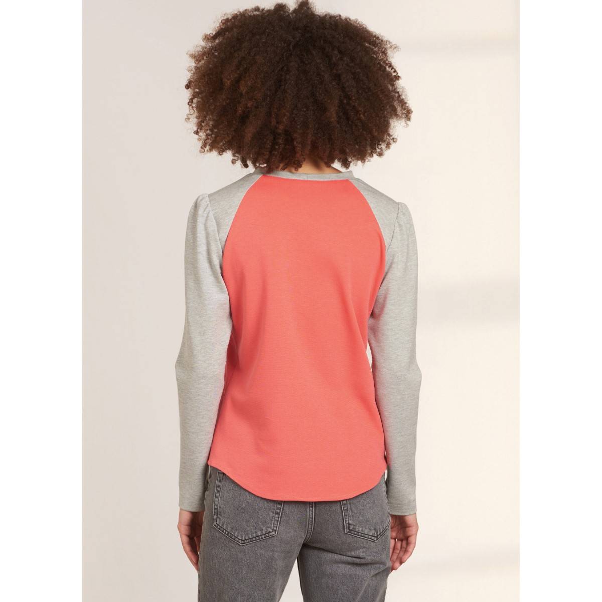 Pullover crew neck tops have puffed sleeves in four lengths and include drawstring and contrast variations.