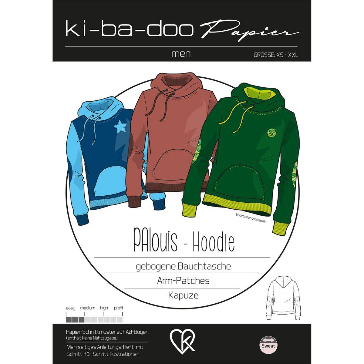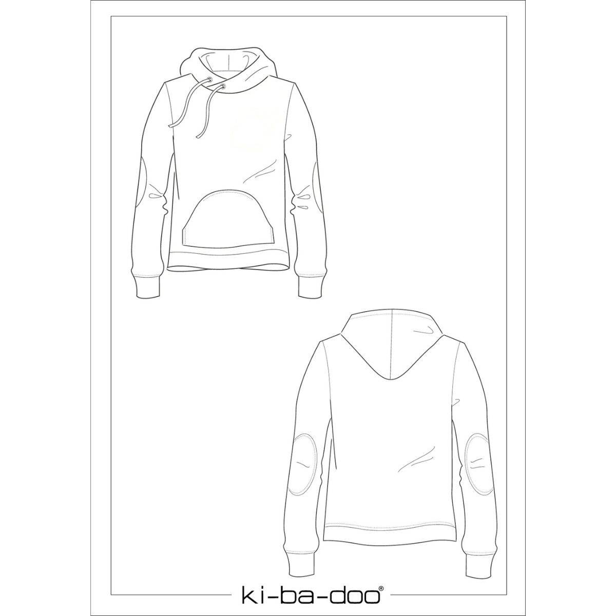 PAlouis is a hoodie designed for sweat fabrics with fashionable details. The large, cozy hood is a defining feature of PAlouis, but it can also be sewn with a warm collar instead. The rounded kangaroo pocket and the large elbow patches complete the cool hoodie look. It has a comfortably relaxed fit and can also be made for girls/women.