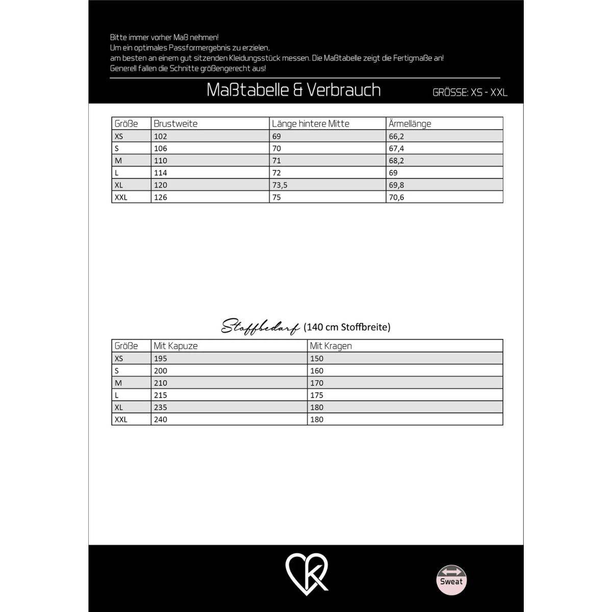 This set includes all pattern pieces in sizes XS–XXL, printed in color on a DIN A0 sheet, as well as a detailed, fully illustrated sewing instruction booklet in DIN A4 format. Our patterns are printed on a DIN A0 sheet. Depending on the number and size of the pattern pieces, they may overlap and need to be traced separately. Seam allowance is not included in the pattern.