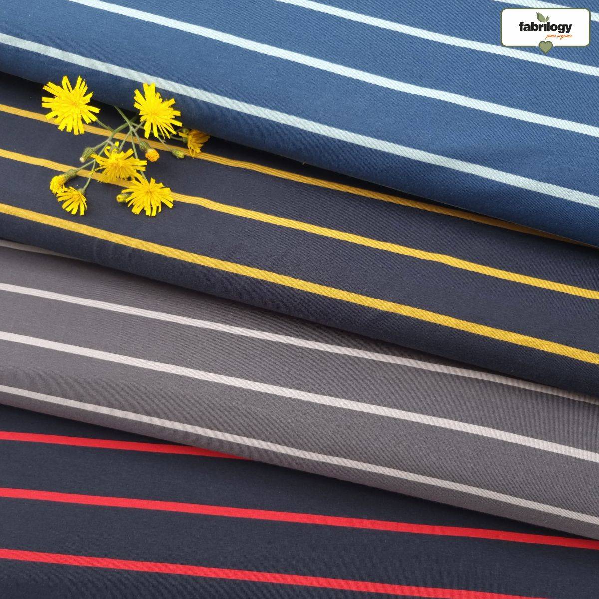 Jersey stripe is a knitted fabric, which means that during production one loop of thread is looped into another loop. In jersey stripe, two pre-dyed yarns are used for this purpose, which creates the stripe pattern. By using right stitches on one side and purl stitches on the other, the jersey stripe creates very little texture, providing a smooth surface.