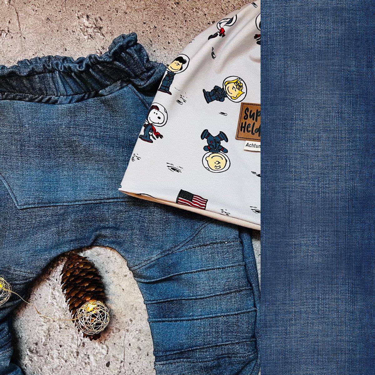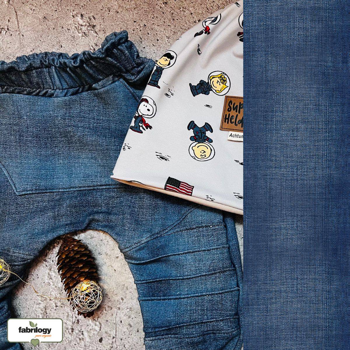 Made from 95% organic cotton and 5% elastane, this fabric is GOTS certified, ensuring sustainability and skin-friendliness. The outer surface mimics the look of real denim, while the looped inner side feels soft and comfortable against the skin.